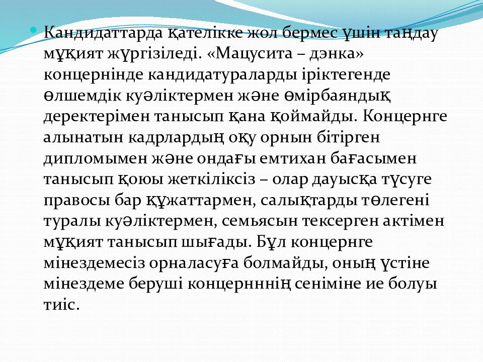 Кандидаттарда қателікке жол бермес үшін таңдау мұқият жүргізіледі. «Мацусита – дэнка» концернінде кандидатураларды іріктегенде өлшемдік куәліктермен және өмірбаяндық деректерімен танысып қана қоймайды. Концернге алынатын кадрлардың оқу орнын бітірген дипломымен және ондағы емтихан бағасымен танысып қоюы жеткіліксіз – олар дауысқа түсуге правосы бар құжаттармен, салықтарды төлегені туралы куәліктермен, семьясын тексерген актімен мұқият танысып шығады. Бұл концернге мінездемесіз орналасуға болмайды, оның үстіне мінездеме беруші концернннің сеніміне ие болуы тиіс.