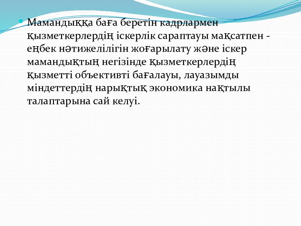 Мамандыққа баға беретін кадрлармен қызметкерлердің іскерлік сараптауы мақсатпен - еңбек нәтижелілігін жоғарылату және іскер мамандықтың негізінде қызметкерлердің қызметті объективті бағалауы, лауазымды міндеттердің нарықтық экономика нақтылы талаптарына сай келуі.
