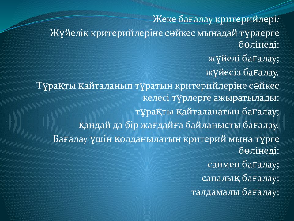 Жеке бағалау критерийлері : Жүйелік критерийлеріне сәйкес мынадай түрлерге бөлінеді: жүйелі бағалау; жүйесіз бағалау. Тұрақты қайталанып тұратын критерийлеріне сәйкес келесі түрлерге ажыратылады: тұрақты қайталанатын бағалау; қандай да бір жағдайға байланысты бағалау. Бағалау үшін қолданылатын критерий мына түрге бөлінеді: санмен бағалау; сапалық бағалау; талдамалы бағалау;