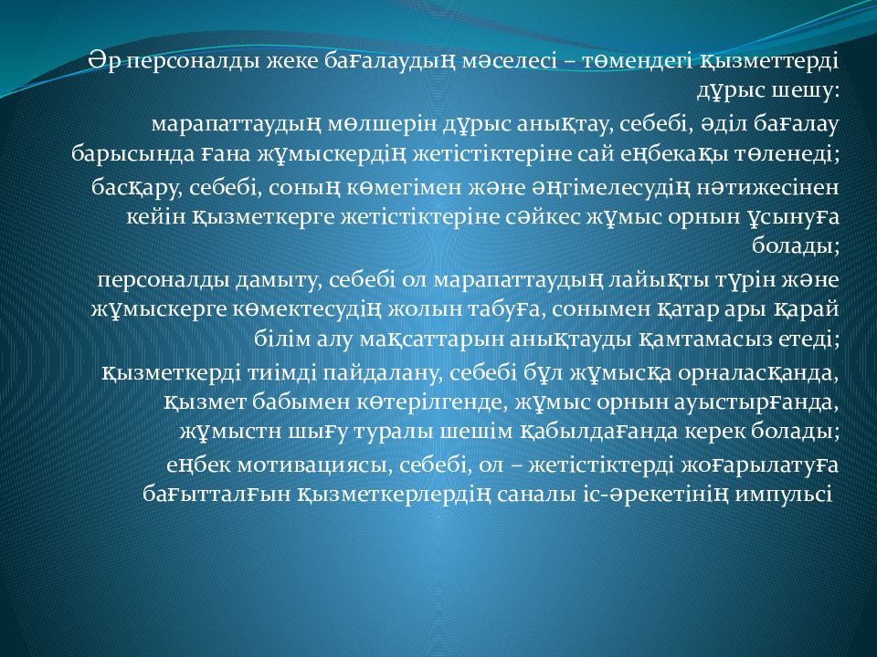 Әр персоналды жеке бағалаудың мәселесі – төмендегі қызметтерді дұрыс шешу: марапаттаудың мөлшерін дұрыс анықтау, себебі, әділ бағалау барысында ғана жұмыскердің жетістіктеріне сай еңбекақы төленеді; басқару, себебі, соның көмегімен және әңгімелесудің нәтижесінен кейін қызметкерге жетістіктеріне сәйкес жұмыс орнын ұсынуға болады; персоналды дамыту, себебі ол марапаттаудың лайықты түрін және жұмыскерге көмектесудің жолын табуға, сонымен қатар ары қарай білім алу мақсаттарын анықтауды қамтамасыз етеді; қызметкерді тиімді пайдалану, себебі бұл жұмысқа орналасқанда, қызмет бабымен көтерілгенде, жұмыс орнын ауыстырғанда, жұмыстн шығу туралы шешім қабылдағанда керек болады; еңбек мотивациясы, себебі, ол – жетістіктерді жоғарылатуға бағытталғын қызметкерлердің саналы іс-әрекетінің импульсі