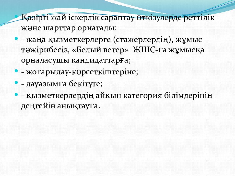 Қазіргі жай іскерлік сараптау өткізулерде реттілік және шарттар орнатады: - жаңа қызметкерлерге (стажерлердің), жұмыс тәжірибесіз, «Белый ветер» ЖШС-ға жұмысқа орналасушы кандидаттарға; - жоғарылау-көрсеткіштеріне; - лауазымға бекітуге; - қызметкерлердің айқын категория білімдерінің деңгейін анықтауға.