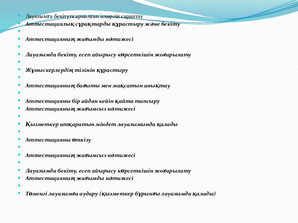 Лауазымға бекітуге арналған іскерлік сараптау Аттестациялық сұрақтарды құрастыру және бекіту Аттестацияның жағымды нәтижесі Лауазымда бекіту, есеп айырысу көрсеткішін жоғарылату Жұмыскерлердің тізімін құрастыру Аттестацияның бағыты мен мақсатын анықтау Аттестацияны бір айдан кейін қайта тапсыру Аттестацияның жағымсыз нәтижесі Қызметкер атқаратын міндет лауазымында қалады Аттестацияны өткізу Аттестацияның жағымсыз нәтижесі Лауазымда бекіту, есеп айырысу көрсеткішін жоғарылату Аттестацияның жағымды нәтижесі Төменгі лауазымға аудару (қызметкер бұрынғы лауазымда қалады)