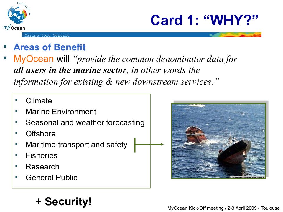 Climate Marine Environment Seasonal and weather forecasting Offshore Maritime transport and safety Fisheries Research General Public Card 1: “WHY?” Areas of Benefit MyOcean will “provide the common denominator data for all users in the marine sector, in other words the information for existing & new downstream services.” + Security !