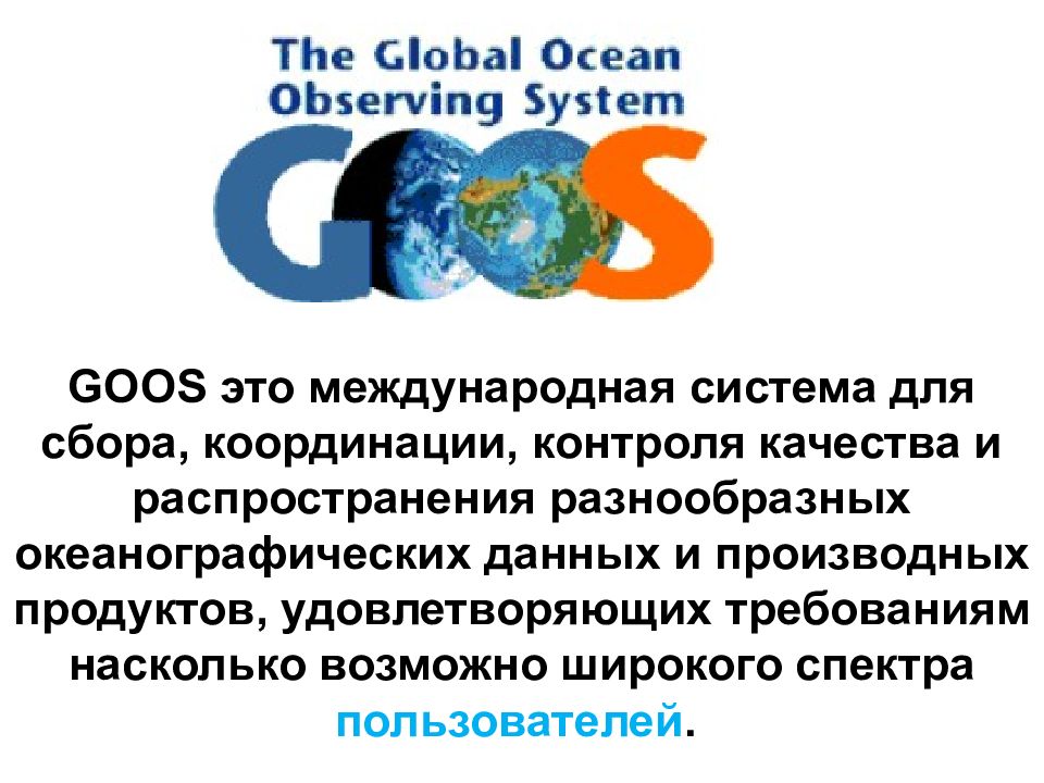 GOOS это международная система для сбора, координации, контроля качества и распространения разнообразных океанографических данных и производных продуктов, удовлетворяющих требованиям насколько возможно широкого спектра пользователей.