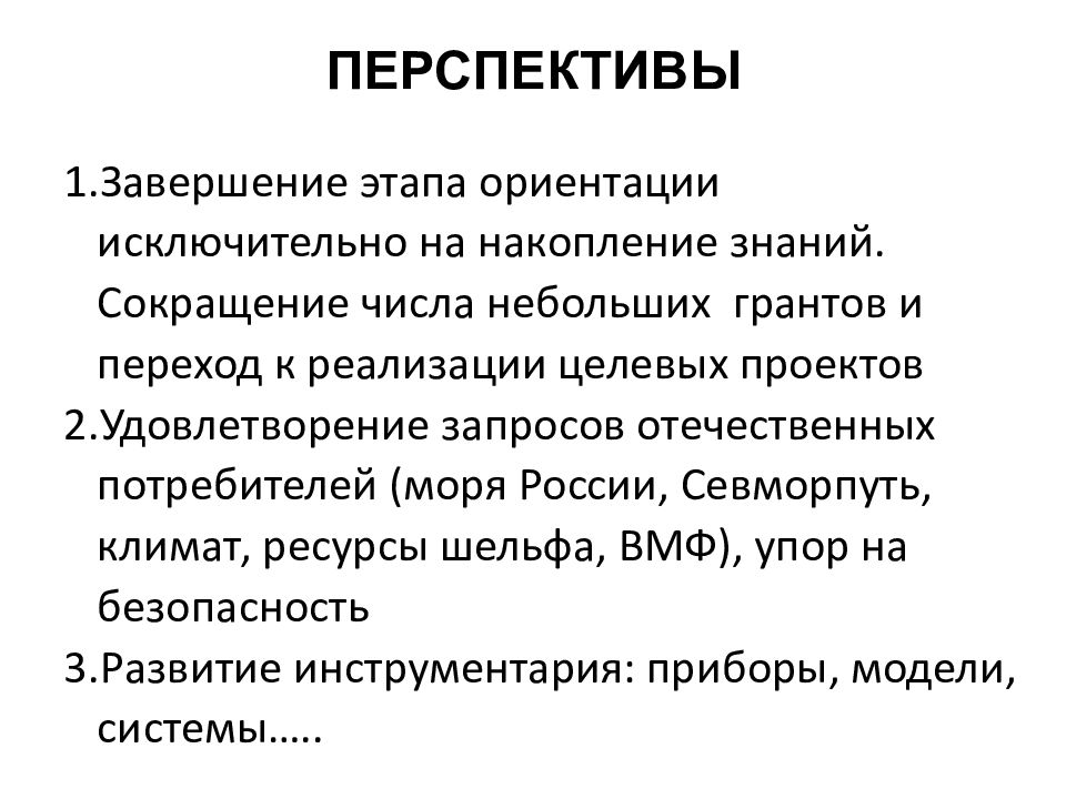 Завершение этапа ориентации исключительно на накопление знаний. Сокращение числа небольших грантов и переход к реализации целевых проектов Удовлетворение запросов отечественных потребителей (моря России, Севморпуть, климат, ресурсы шельфа, ВМФ), упор на безопасность Развитие инструментария: приборы, модели, системы….. ПЕРСПЕКТИВЫ