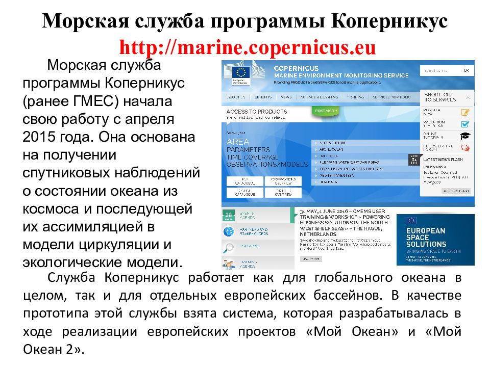 Морская служба программы Коперникус (ранее ГМЕС) нача ла свою работу с апреля 2015 года. Она основана на получении спутниковых наблюдений о состоянии океана из космоса и последующей их ассимиляцией в модели циркуляции и экологические модели. Служба Коперникус работа ет как для глобального океана в целом, так и для отдельных европейских бассейнов. В качестве прототипа этой службы взята система, которая разрабатывалась в ходе реализации европейских проектов «Мой Океан» и «Мой Океан 2 ».