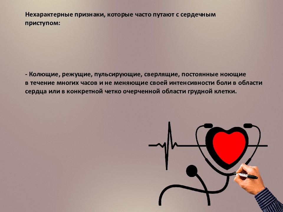 Нехарактерные признаки, которые часто путают с сердечным приступом: - Колющие, режущие, пульсирующие, сверлящие, постоянные ноющие в течение многих часов и не меняющие своей интенсивности боли в области сердца или в конкретной четко очерченной области грудной клетки.