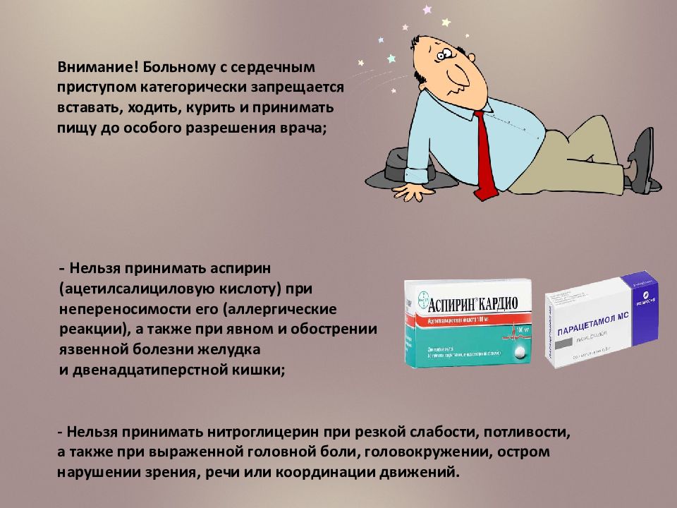 - Нельзя принимать аспирин (ацетилсалициловую кислоту) при непереносимости его (аллергические реакции), а также при явном и обострении язвенной болезни желудка и двенадцатиперстной кишки; Внимание! Больному с сердечным приступом категорически запрещается вставать, ходить, курить и принимать пищу до особого разрешения врача; - Нельзя принимать нитроглицерин при резкой слабости, потливости, а также при выраженной головной боли, головокружении, остром нарушении зрения, речи или координации движений.
