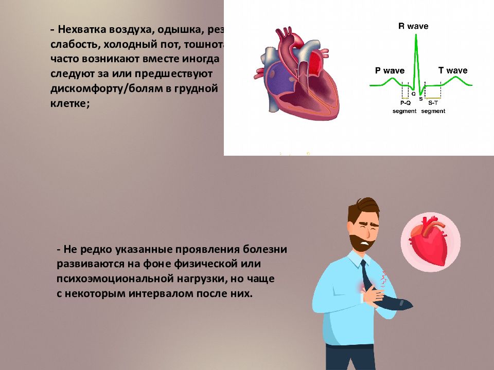 - Нехватка воздуха, одышка, резкая слабость, холодный пот, тошнота часто возникают вместе иногда следуют за или предшествуют дискомфорту/болям в грудной клетке; - Не редко указанные проявления болезни развиваются на фоне физической или психоэмоциональной нагрузки, но чаще с некоторым интервалом после них.