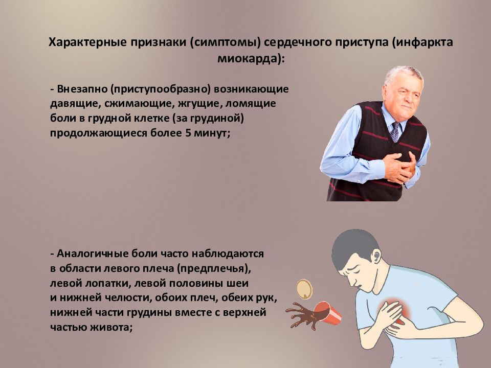 Слайд 2: Характерные признаки (симптомы) сердечного приступа (инфаркта миокарда):