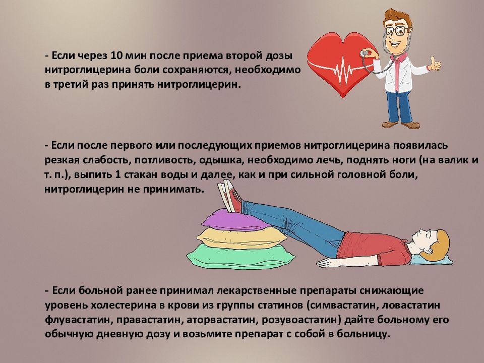 - Если больной ранее принимал лекарственные препараты снижающие уровень холестерина в крови из группы статинов ( симвастатин, ловастатин флувастатин, правастатин, аторвастатин, розувоастатин ) дайте больному его обычную дневную дозу и возьмите препарат с собой в больницу. - Если через 10 мин после приема второй дозы нитроглицерина боли сохраняются, необходимо в третий раз принять нитроглицерин. - Если после первого или последующих приемов нитроглицерина появилась резкая слабость, потливость, одышка, необходимо лечь, поднять ноги (на валик и т. п.), выпить 1 стакан воды и далее, как и при сильной головной боли, нитроглицерин не принимать.