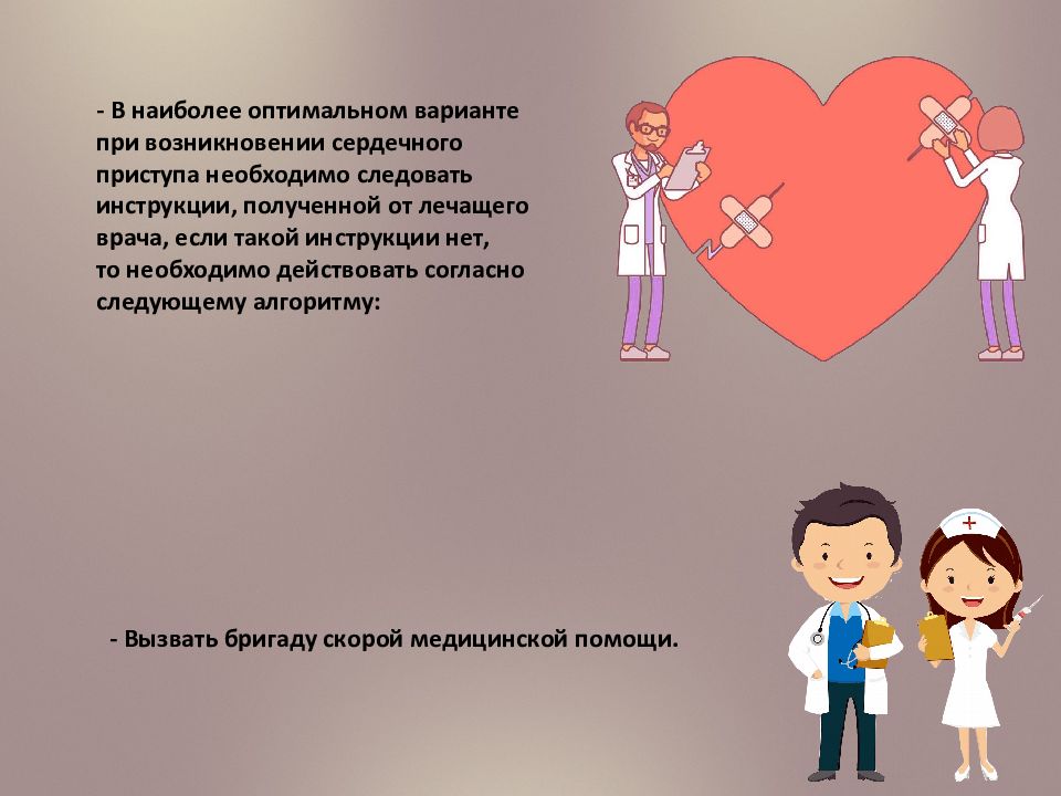 - В наиболее оптимальном варианте при возникновении сердечного приступа необходимо следовать инструкции, полученной от лечащего врача, если такой инструкции нет, то необходимо действовать согласно следующему алгоритму: - Вызвать бригаду скорой медицинской помощи.