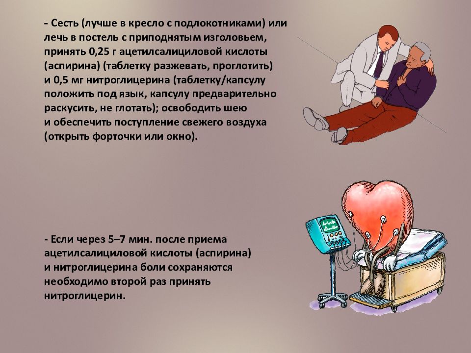 - Сесть (лучше в кресло с подлокотниками) или лечь в постель с приподнятым изголовьем, принять 0,25 г ацетилсалициловой кислоты (аспирина) (таблетку разжевать, проглотить) и 0,5 мг нитроглицерина (таблетку/капсулу положить под язык, капсулу предварительно раскусить, не глотать); освободить шею и обеспечить поступление свежего воздуха (открыть форточки или окно). - Если через 5–7 мин. после приема ацетилсалициловой кислоты (аспирина) и нитроглицерина боли сохраняются необходимо второй раз принять нитроглицерин.