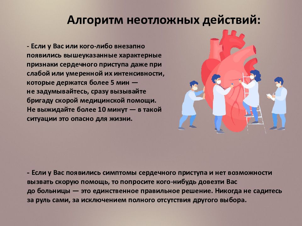 - Если у Вас появились симптомы сердечного приступа и нет возможности вызвать скорую помощь, то попросите кого-нибудь довезти Вас до больницы — это единственное правильное решение. Никогда не садитесь за руль сами, за исключением полного отсутствия другого выбора. Алгоритм неотложных действий: - Если у Вас или кого-либо внезапно появились вышеуказанные характерные признаки сердечного приступа даже при слабой или умеренной их интенсивности, которые держатся более 5 мин — не задумывайтесь, сразу вызывайте бригаду скорой медицинской помощи. Не выжидайте более 10 минут — в такой ситуации это опасно для жизни.