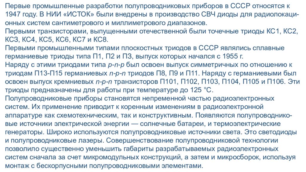 Первые промышленные разработки полупроводниковых приборов в СССР относятся к 1947 году. В НИИ «ИСТОК» были внедрены в производство СВЧ диоды для радиолокаци-онных систем сантиметрового и миллиметрового диапазонов. Первыми транзисторами, выпущенными отечественной были точечные триоды КС1, КС2, КСЗ, КС4, КС5, КС6, КС7 и КС8. Первыми промышленными типами плоскостных триодов в СССР являлись сплавные германиевые триоды типа П1, П2 и ПЗ, выпуск которых начался с 1955 г. Наряду с этими триодами типа р-n-р был освоен выпуск симметричных по отношению к триодам П13-П15 германиевых n-р-n триодов П8, П9 и П11. Наряду с германиевыми был освоен выпуск кремниевых n-p-n транзисторов П101, П102, П103, П104, П105 и П106. Эти триоды предназначены для работы при температуре до 125 °C. Полупроводниковые приборы становятся непременной частью радиоэлектронных систем. Их применение приводит к коренным изменениям в радиоэлектронной аппаратуре как схемотехническим, так и конструктивным. Появляются полупроводнико -вые источники электрической энергии — солнечные батареи, и термоэлектрические генераторы. Широко используются полупроводниковые источники света. Это светодиоды и полупроводниковые лазеры. Совершенствование полупроводниковой технологии позволило существенно уменьшить габариты разрабатываемых радиоэлектронных систем сначала за счет микромодульных конструкций, а затем и микросборок, используя монтаж с бескорпусными полупроводниковыми элементами.