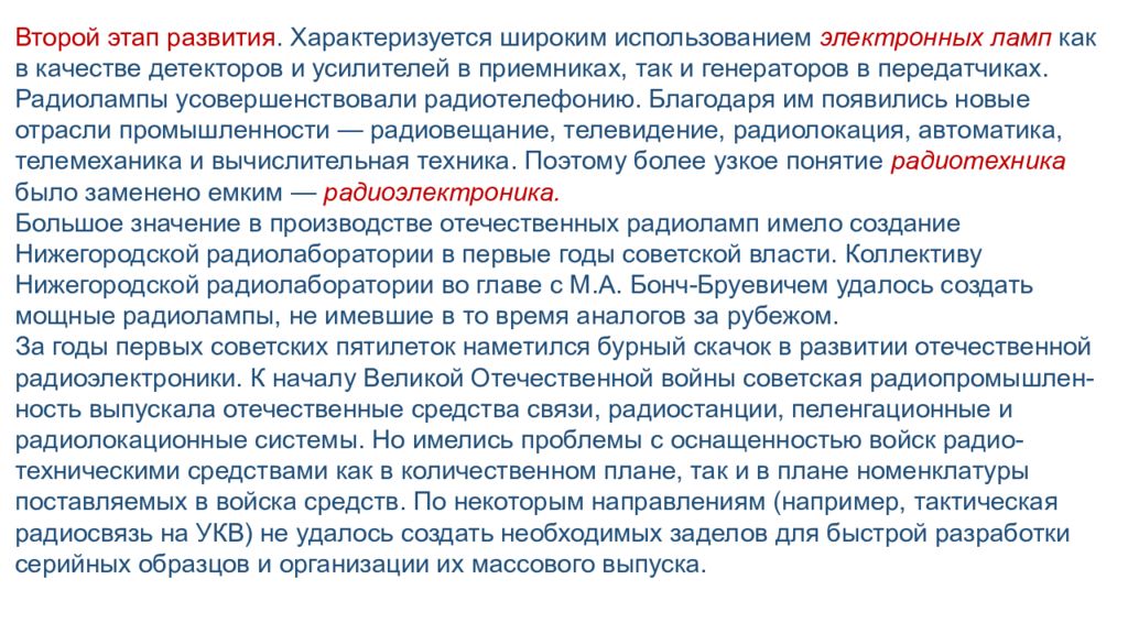Второй этап развития. Характеризуется широким использованием электронных ламп как в качестве детекторов и усилителей в приемниках, так и генераторов в передатчиках. Радиолампы усовершенствовали радиотелефонию. Благодаря им появились новые отрасли промышленности — радиовещание, телевидение, радиолокация, автоматика, телемеханика и вычислительная техника. Поэтому более узкое понятие радиотехника было заменено емким — радиоэлектроника. Большое значение в производстве отечественных радиоламп имело создание Нижегородской радиолаборатории в первые годы советской власти. Коллективу Нижегородской радиолаборатории во главе с М.А. Бонч-Бруевичем удалось создать мощные радиолампы, не имевшие в то время аналогов за рубежом. За годы первых советских пятилеток наметился бурный скачок в развитии отечественной радиоэлектроники. К началу Великой Отечественной войны советская радиопромышлен-ность выпускала отечественные средства связи, радиостанции, пеленгационные и радиолокационные системы. Но имелись проблемы с оснащенностью войск радио-техническими средствами как в количественном плане, так и в плане номенклатуры поставляемых в войска средств. По некоторым направлениям (например, тактическая радиосвязь на УКВ) не удалось создать необходимых заделов для быстрой разработки серийных образцов и организации их массового выпуска.