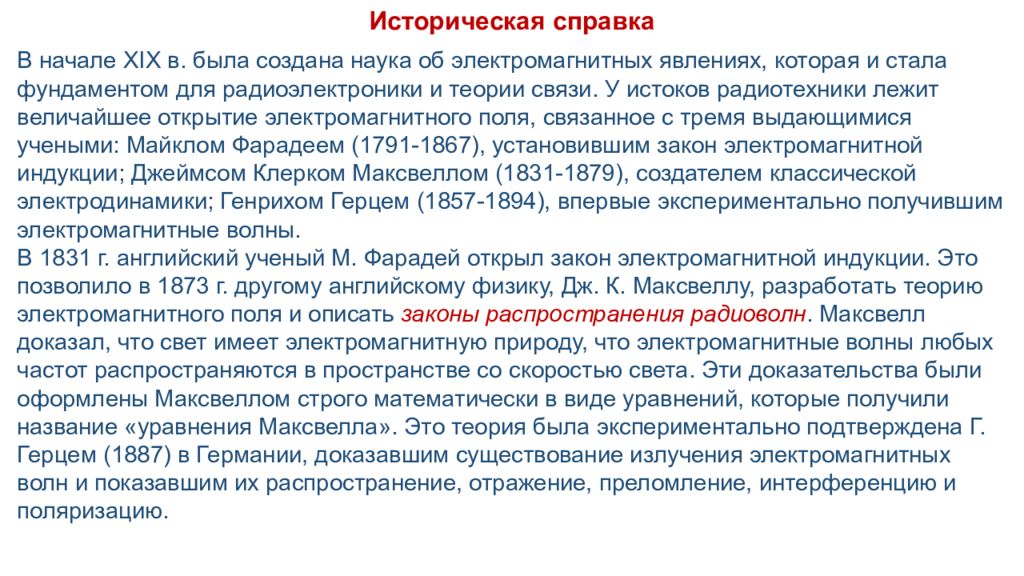 Историческая справка В начале XIX в. была создана наука об электромагнитных явлениях, которая и стала фундаментом для радиоэлектроники и теории связи. У истоков радиотехники лежит величайшее открытие электромагнитного поля, связанное с тремя выдающимися учеными: Майклом Фарадеем (1791-1867), установившим закон электромагнитной индукции; Джеймсом Клерком Максвеллом (1831-1879), создателем классической электродинамики; Генрихом Герцем (1857-1894), впервые экспериментально получившим электромагнитные волны. В 1831 г. английский ученый М. Фарадей открыл закон электромагнитной индукции. Это позволило в 1873 г. другому английскому физику, Дж. К. Максвеллу, разработать теорию электромагнитного поля и описать законы распространения радиоволн. Максвелл доказал, что свет имеет электромагнитную природу, что электромагнитные волны любых частот распространяются в пространстве со скоростью света. Эти доказательства были оформлены Максвеллом строго математически в виде уравнений, которые получили название «уравнения Максвелла». Это теория была экспериментально подтверждена Г. Герцем (1887) в Германии, доказавшим существование излучения электромагнитных волн и показавшим их распространение, отражение, преломление, интерференцию и поляризацию.