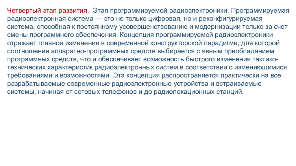 Четвертый этап развития. Этап программируемой радиоэлектроники. Программируемая радиоэлектронная система — это не только цифровая, но и реконфигурируемая система, способная к постоянному усовершенствованию и модернизации только за счет смены программного обеспечения. Концепция программируемой радиоэлектроники отражает главное изменение в современной конструкторской парадигме, для которой соотношение аппаратно-программных средств выбирается с явным преобладанием программных средств, что и обеспечивает возможность быстрого изменения тактико-технических характеристик радиоэлектронных систем в соответствии с изменяющимися требованиями и возможностями. Эта концепция распространяется практически на все разрабатываемые современные радиоэлектронные устройства и встраиваемые системы, начиная от сотовых телефонов и до радиолокационных станций.