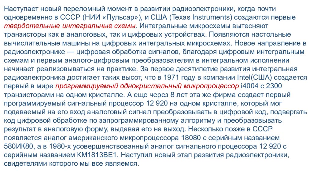 Наступает новый переломный момент в развитии радиоэлектроники, когда почти одновременно в СССР (НИИ «Пульсар»), и США ( Texas Instruments ) создаются первые твердотельные интегральные схемы. Интегральные микросхемы вытесняют транзисторы как в аналоговых, так и цифровых устройствах. Появляются настольные вычислительные машины на цифровых интегральных микросхемах. Новое направление в радиоэлектронике — цифровая обработка сигналов, благодаря цифровым интегральным схемам и первым аналого-цифровым преобразователям в интегральном исполнении начинает реализовываться на практике. За первое десятилетие развития интегральная радиоэлектроника достигает таких высот, что в 1971 году в компании Intel (США) создается первый в мире программируемый однокристальный микропроцессор i4004 с 2300 транзисторами на одном кристалле. А еще через 8 лет эта же фирма создает первый программируемый сигнальный процессор 12 920 на одном кристалле, который мог подаваемый на его вход аналоговый сигнал преобразовывать в цифровой код, подвергать код цифровой обработке по запрограммированному алгоритму и преобразовывать результат в аналоговую форму, выдавая его на выход. Несколько позже в СССР появляется аналог американского микропроцессора 18080 с серийным названием 580ИК80, а в 1980-х усовершенствованный аналог сигнального процессора 12 920 с серийным названием КМ1813ВЕ1. Наступил новый этап развития радиоэлектроники, свидетелями которого мы все являемся.