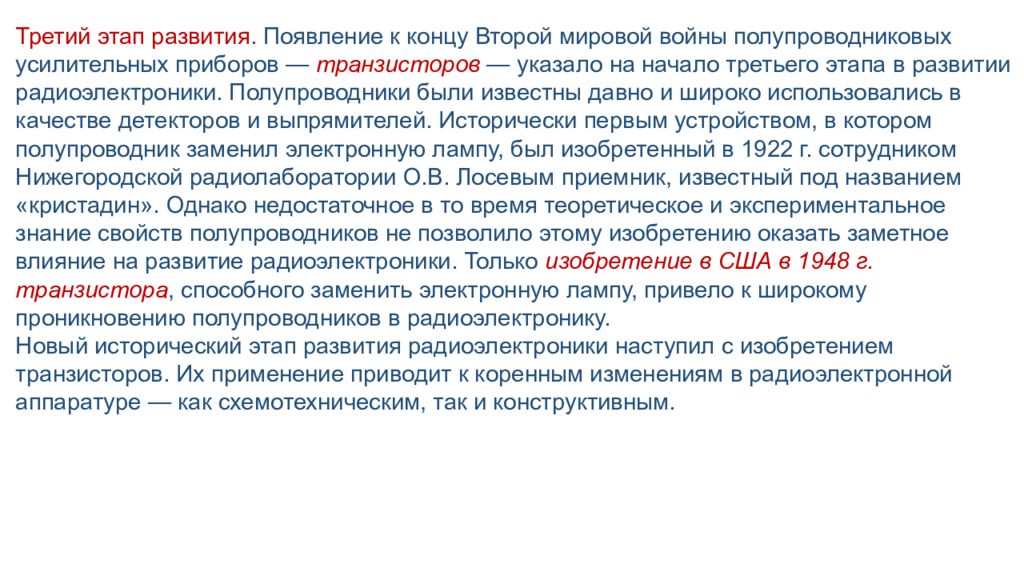 Третий этап развития. Появление к концу Второй мировой войны полупроводниковых усилительных приборов — транзисторов — указало на начало третьего этапа в развитии радиоэлектроники. Полупроводники были известны давно и широко использовались в качестве детекторов и выпрямителей. Исторически первым устройством, в котором полупроводник заменил электронную лампу, был изобретенный в 1922 г. сотрудником Нижегородской радиолаборатории О.В. Лосевым приемник, известный под названием «кристадин». Однако недостаточное в то время теоретическое и экспериментальное знание свойств полупроводников не позволило этому изобретению оказать заметное влияние на развитие радиоэлектроники. Только изобретение в США в 1948 г. транзистора, способного заменить электронную лампу, привело к широкому проникновению полупроводников в радиоэлектронику. Новый исторический этап развития радиоэлектроники наступил с изобретением транзисторов. Их применение приводит к коренным изменениям в радиоэлектронной аппаратуре — как схемотехническим, так и конструктивным.