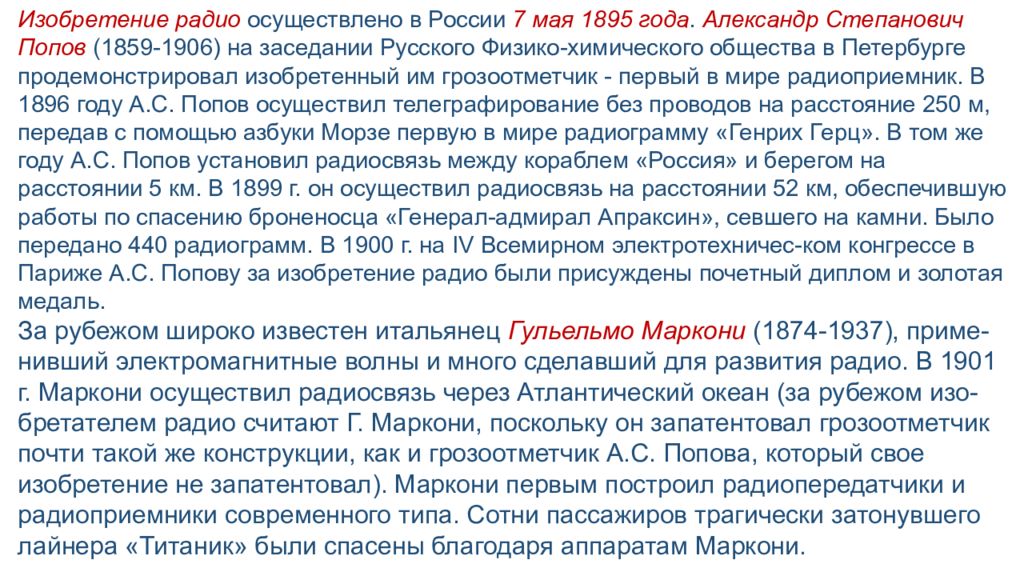 Изобретение радио осуществлено в России 7 мая 1895 года. Александр Степанович Попов (1859-1906) на заседании Русского Физико-химического общества в Петербурге продемонстрировал изобретенный им грозоотметчик - первый в мире радиоприемник. В 1896 году А.С. Попов осуществил телеграфирование без проводов на расстояние 250 м, передав с помощью азбуки Морзе первую в мире радиограмму «Генрих Герц». В том же году А.С. Попов установил радиосвязь между кораблем «Россия» и берегом на расстоянии 5 км. В 1899 г. он осуществил радиосвязь на расстоянии 52 км, обеспечившую работы по спасению броненосца «Генерал-адмирал Апраксин», севшего на камни. Было передано 440 радиограмм. В 1900 г. на IV Всемирном электротехничес -ком конгрессе в Париже А.С. Попову за изобретение радио были присуждены почетный диплом и золотая медаль. За рубежом широко известен итальянец Гульельмо Маркони (1874-1937), приме- нивший электромагнитные волны и много сделавший для развития радио. В 1901 г. Маркони осуществил радиосвязь через Атлантический океан (за рубежом изо- бретателем радио считают Г. Маркони, поскольку он запатентовал грозоотметчик почти такой же конструкции, как и грозоотметчик А.С. Попова, который свое изобретение не запатентовал). Маркони первым построил радиопередатчики и радиоприемники современного типа. Сотни пассажиров трагически затонувшего лайнера «Титаник» были спасены благодаря аппаратам Маркони.