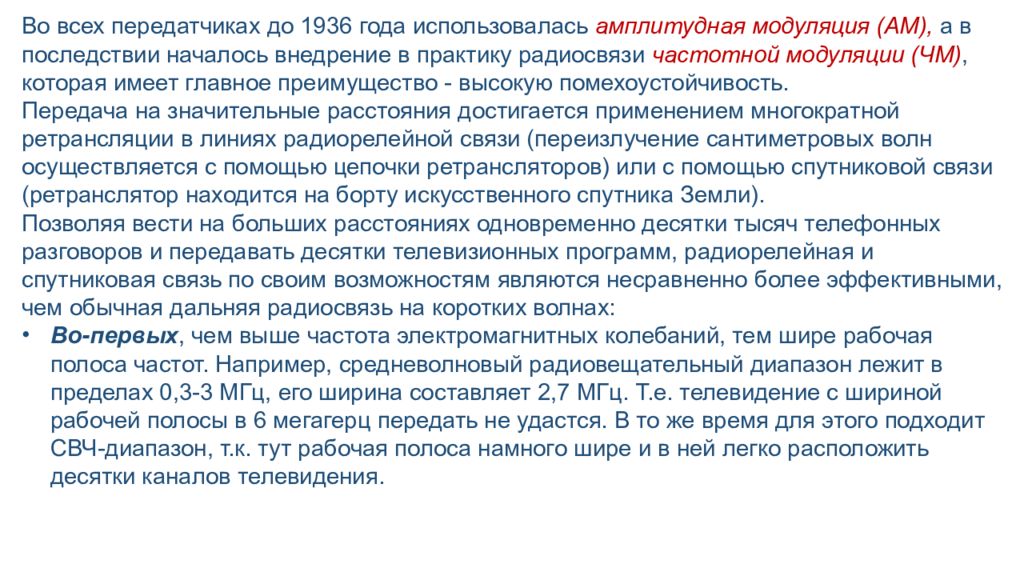 Во всех передатчиках до 1936 года использовалась амплитудная модуляция (АМ), а в последствии началось внедрение в практику радиосвязи частотной модуляции (ЧМ), которая имеет главное преимущество - высокую помехоустойчивость. Передача на значительные расстояния достигается применением многократной ретрансляции в линиях радиорелейной связи ( переизлучение сантиметровых волн осуществляется с помощью цепочки ретрансляторов) или с помощью спутниковой связи (ретранслятор находится на борту искусственного спутника Земли). Позволяя вести на больших расстояниях одновременно десятки тысяч телефонных разговоров и передавать десятки телевизионных программ, радиорелейная и спутниковая связь по своим возможностям являются несравненно более эффективными, чем обычная дальняя радиосвязь на коротких волнах : Во-первых, чем выше частота электромагнитных колебаний, тем шире рабочая полоса частот. Например, средневолновый радиовещательный диапазон лежит в пределах 0,3-3 МГц, его ширина составляет 2,7 МГц. Т.е. телевидение с шириной рабочей полосы в 6 мегагерц передать не удастся. В то же время для этого подходит СВЧ-диапазон, т.к. тут рабочая полоса намного шире и в ней легко расположить десятки каналов телевидения.