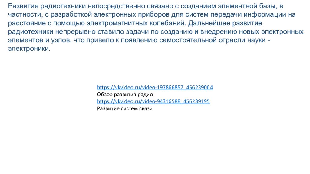 Развитие радиотехники непосредственно связано с созданием элементной базы, в частности, с разработкой электронных приборов для систем передачи информации на расстояние с помощью электромагнитных колебаний. Дальнейшее развитие радиотехники непрерывно ставило задачи по созданию и внедрению новых электронных элементов и узлов, что привело к появлению самостоятельной отрасли науки - электроники. https:// vkvideo.ru/video-197866857_456239064 Обзор развития радио https:// vkvideo.ru/video-94316588_456239195 Развитие систем связи