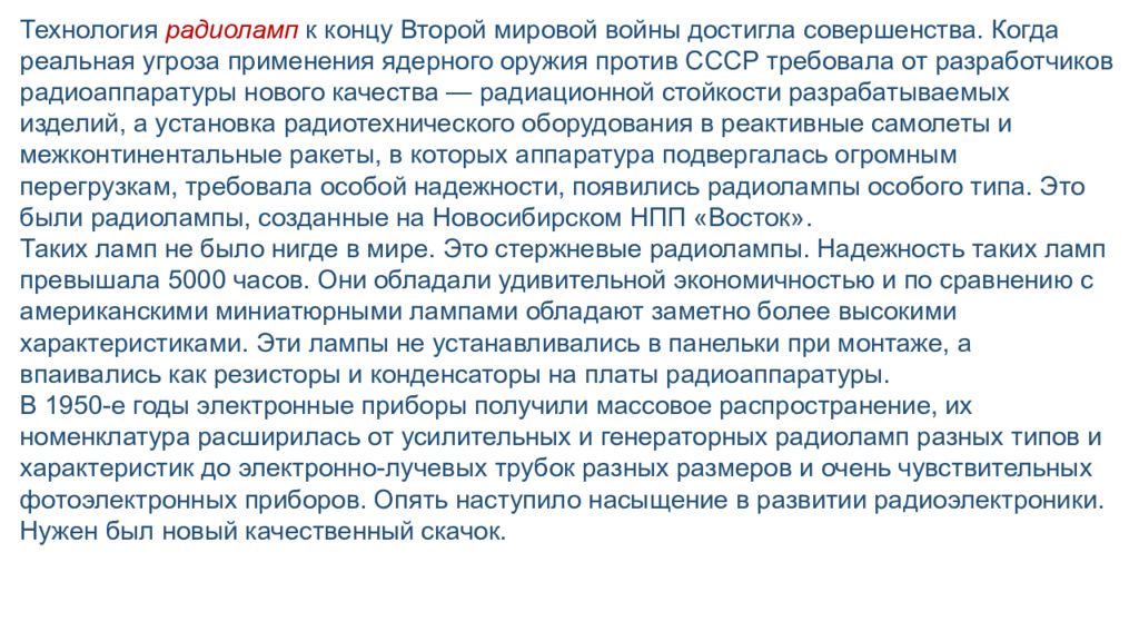 Технология радиоламп к концу Второй мировой войны достигла совершенства. Когда реальная угроза применения ядерного оружия против СССР требовала от разработчиков радиоаппаратуры нового качества — радиационной стойкости разрабатываемых изделий, а установка радиотехнического оборудования в реактивные самолеты и межконтинентальные ракеты, в которых аппаратура подвергалась огромным перегрузкам, требовала особой надежности, появились радиолампы особого типа. Это были радиолампы, созданные на Новосибирском НПП «Восток». Таких ламп не было нигде в мире. Это стержневые радиолампы. Надежность таких ламп превышала 5000 часов. Они обладали удивительной экономичностью и по сравнению с американскими миниатюрными лампами обладают заметно более высокими характеристиками. Эти лампы не устанавливались в панельки при монтаже, а впаивались как резисторы и конденсаторы на платы радиоаппаратуры. В 1950-е годы электронные приборы получили массовое распространение, их номенклатура расширилась от усилительных и генераторных радиоламп разных типов и характеристик до электронно-лучевых трубок разных размеров и очень чувствительных фотоэлектронных приборов. Опять наступило насыщение в развитии радиоэлектроники. Нужен был новый качественный скачок.