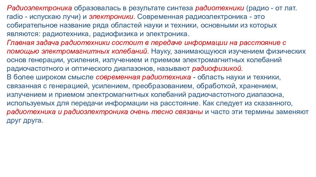 Радиоэлектроника образовалась в результате синтеза радиотехники (радио - от лат. radio - испускаю лучи) и электроники. Современная радиоэлектроника - это собирательное название ряда областей науки и техники, основными из которых являются: радиотехника, радиофизика и электроника. Главная задача радиотехники состоит в передаче информации на расстояние с помощью электромагнитных колебаний. Науку, занимающуюся изучением физических основ генерации, усиления, излучением и приемом электромагнитных колебаний радиочастотного и оптического диапазонов, называют радиофизикой. В более широком смысле современная радиотехника - область науки и техники, связанная с генерацией, усилением, преобразованием, обработкой, хранением, излучением и приемом электромагнитных колебаний радиочастотного диапазона, используемых для передачи информации на расстояние. Как следует из сказанного, радиотехника и радиоэлектроника очень тесно связаны и часто эти термины заменяют друг друга.