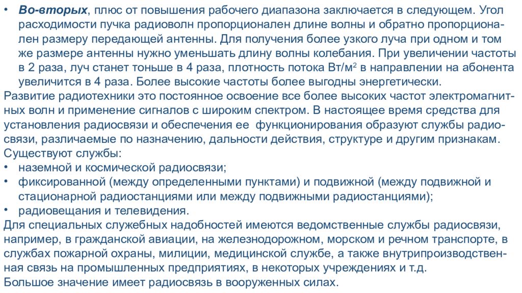 Во-вторых, плюс от повышения рабочего диапазона заключается в следующем. Угол расходимости пучка радиоволн пропорционален длине волны и обратно пропорциона -лен размеру передающей антенны. Для получения более узкого луча при одном и том же размере антенны нужно уменьшать длину волны колебания. При увеличении частоты в 2 раза, луч станет тоньше в 4 раза, плотность потока Вт/м 2 в направлении на абонента увеличится в 4 раза. Более высокие частоты более выгодны энергетически. Развитие радиотехники это постоянное освоение все более высоких частот электромагнит- ных волн и применение сигналов с широким спектром. В настоящее время средства для установления радиосвязи и обеспечения ее функционирования образуют службы радио-связи, различаемые по назначению, дальности действия, структуре и другим признакам. Существуют службы : наземной и космической радиосвязи; фиксированной (между определенными пунктами) и подвижной (между подвижной и стационарной радиостанциями или между подвижными радиостанциями ); радиовещания и телевидения. Для специальных служебных надобностей имеются ведомственные службы радиосвязи, например, в гражданской авиации, на железнодорожном, морском и речном транспорте, в службах пожарной охраны, милиции, медицинской службе, а также внутрипроизводствен-ная связь на промышленных предприятиях, в некоторых учреждениях и т.д. Большое значение имеет радиосвязь в вооруженных силах.