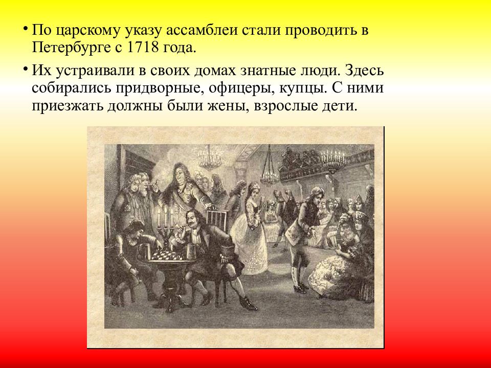 По царскому указу ассамблеи стали проводить в Петербурге с 1718 года. Их устраивали в своих домах знатные люди. Здесь собирались придворные, офицеры, купцы. С ними приезжать должны были жены, взрослые дети.