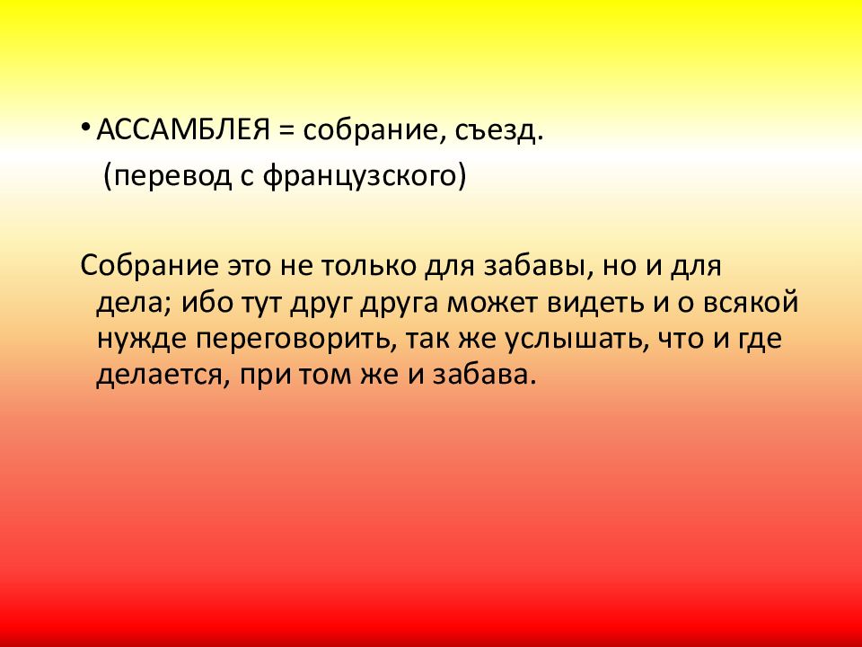 АССАМБЛЕЯ = собрание, съезд. (перевод с французского) Собрание это не только для забавы, но и для дела; ибо тут друг друга может видеть и о всякой нужде переговорить, так же услышать, что и где делается, при том же и забава.