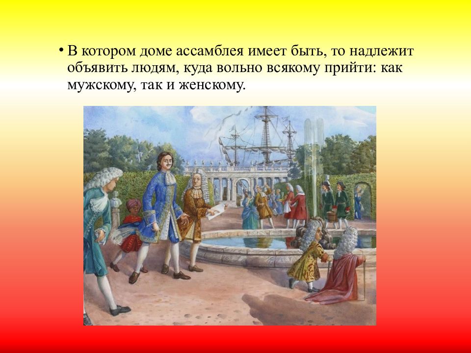 В котором доме ассамблея имеет быть, то надлежит объявить людям, куда вольно всякому прийти: как мужскому, так и женскому.