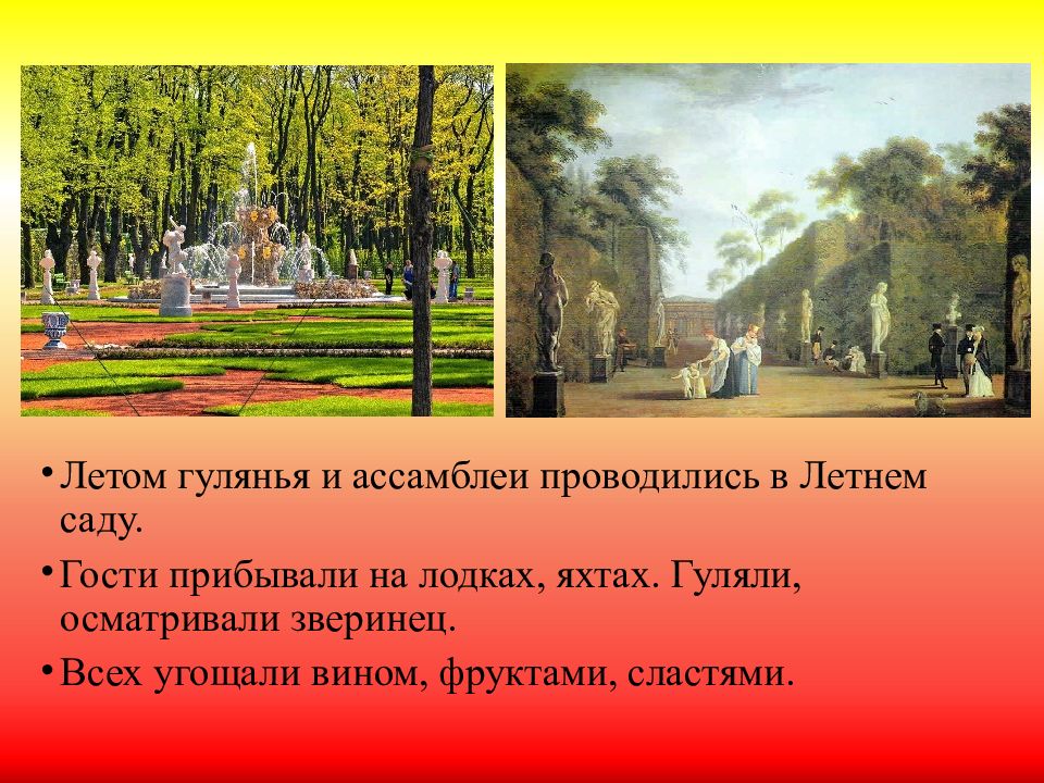 Летом гулянья и ассамблеи проводились в Летнем саду. Гости прибывали на лодках, яхтах. Гуляли, осматривали зверинец. Всех угощали вином, фруктами, сластями.