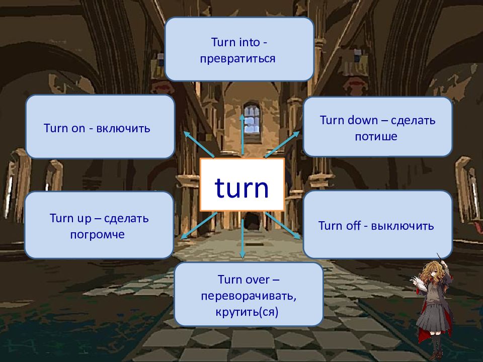 turn Turn on - включить Turn down – сделать потише Turn up – сделать погромче Turn off - выключить Turn into - превратиться Turn over – переворачивать, крутить( ся )