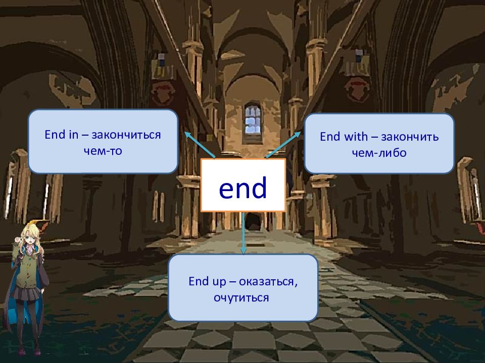 end End in – закончиться чем-то End with – закончить чем-либо End up – оказаться, очутиться