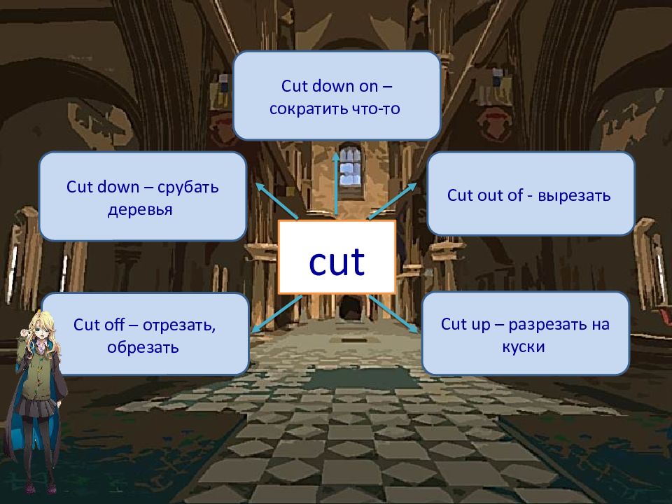 cut Cut down – срубать деревья Cut out of - вырезать Cut off – отрезать, обрезать Cut up – разрезать на куски Cut down on – сократить что-то