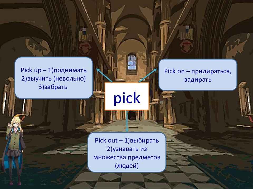 pick Pick up – 1)поднимать 2)выучить (невольно) 3)забрать Pick on – придираться, задирать Pick out – 1)выбирать 2)узнавать из множества предметов (людей)