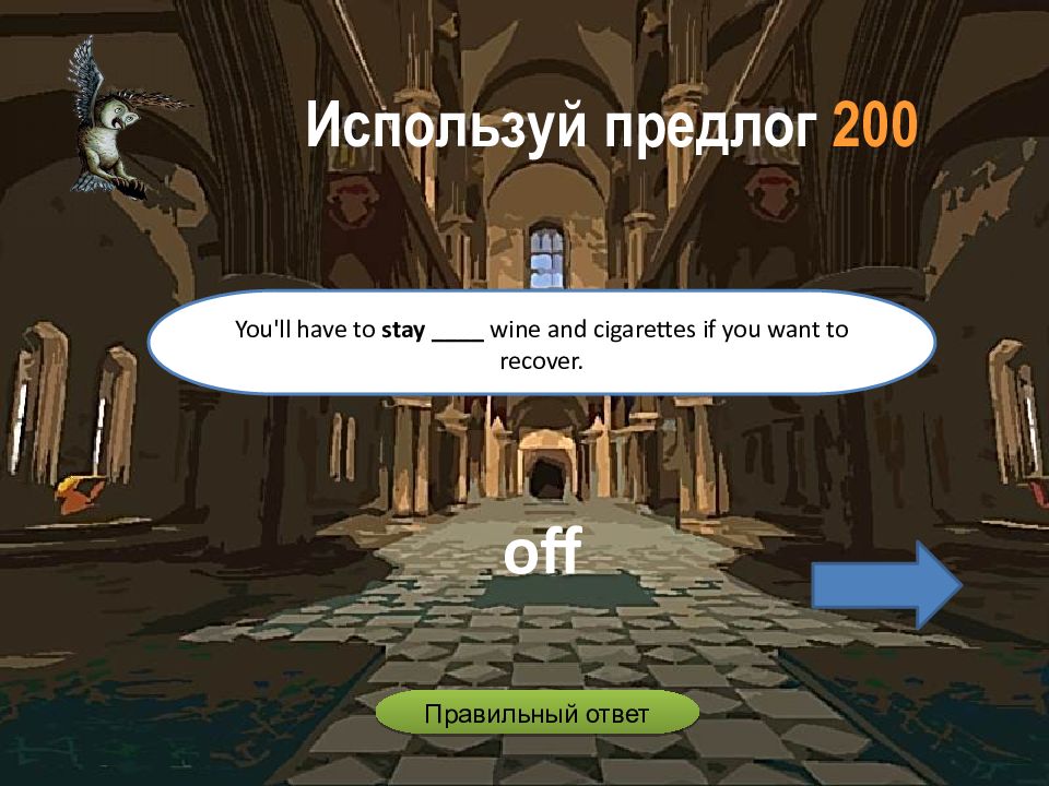 off You'll have to stay ____ wine and cigarettes if you want to recover. Используй предлог 200 Правильный ответ