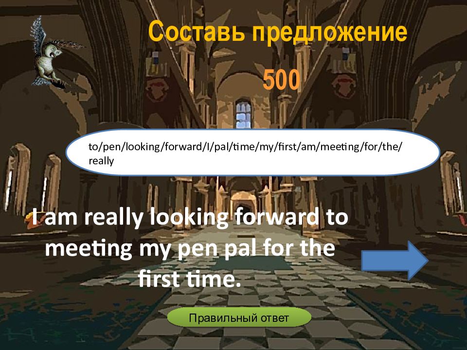 I am really looking forward to meeting my pen pal for the first time. to/pen/looking/forward/I/pal/time/my/first/am/meeting/for/the/really Составь предложение 5 00 Правильный ответ