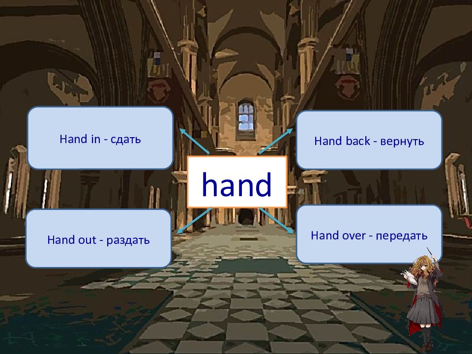hand Hand in - сдать Hand back - вернуть Hand out - раздать Hand over - передать