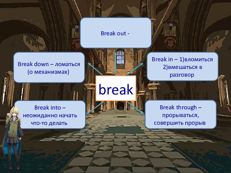 break Break down – ломаться (о механизмах) Break in – 1)вломиться 2)вмешаться в разговор Break into – неожиданно начать что-то делать Break through – прорываться, совершить прорыв Break out -