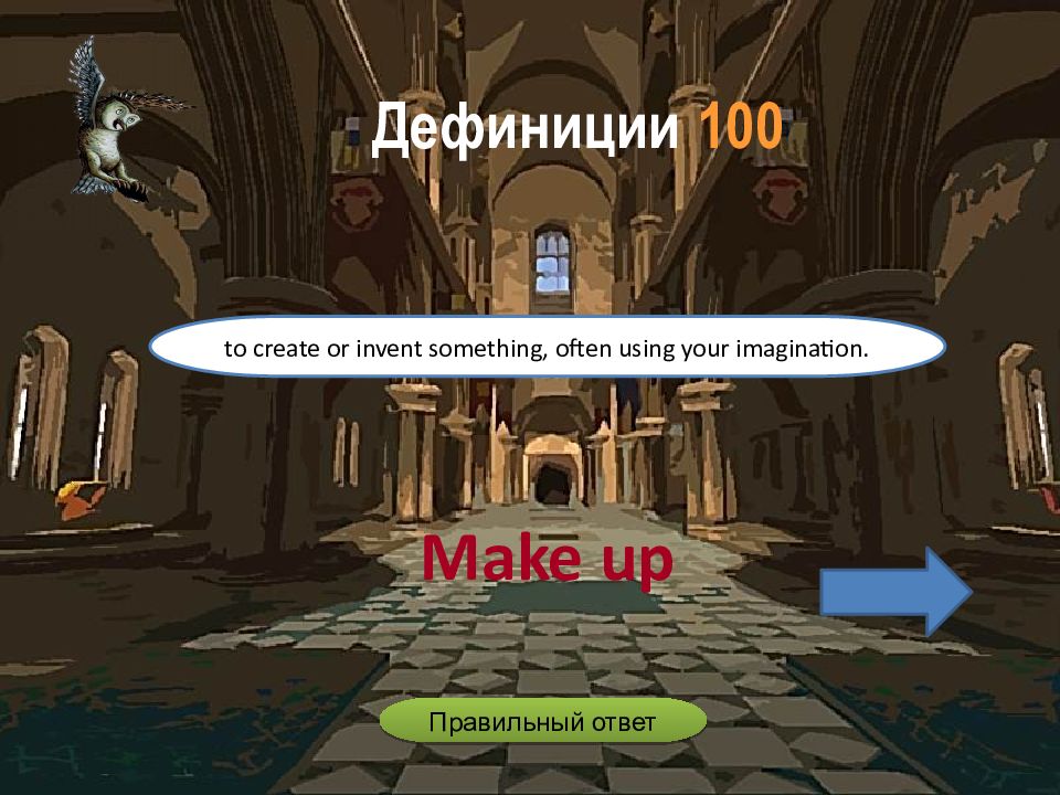 Make up to create or invent something, often using your imagination. Дефиниции 100 Правильный ответ