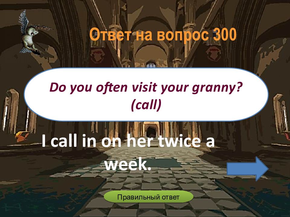 I call in on her twice a week. Do you often visit your granny? (call) Ответ на вопрос 3 00 Правильный ответ