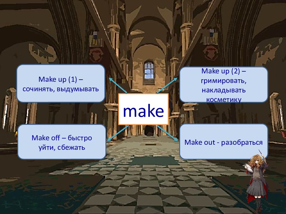 make Make up (1) – сочинять, выдумывать Make up (2) – гримировать, накладывать косметику Make off – быстро уйти, сбежать Make out - разобраться