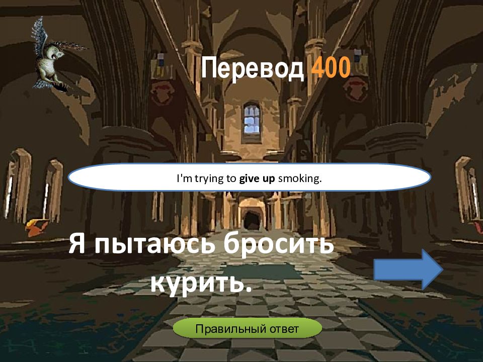 Я пытаюсь бросить курить. I'm trying to give up smoking. Перевод 400 Правильный ответ