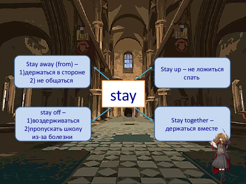 stay Stay away (from) – 1) держаться в стороне 2) не общаться Stay up – не ложиться спать stay off – 1)воздерживаться 2)пропускать школу из-за болезни Stay together – держаться вместе