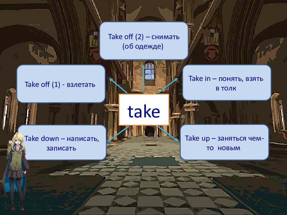take Take off (1) - взлетать Take in – понять, взять в толк Take down – написать, записать Take up – заняться чем-то новым Take off (2) – снимать (об одежде)
