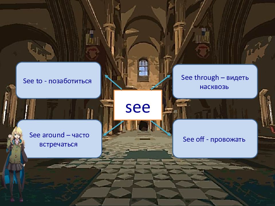 see See to - позаботиться See through – видеть насквозь See around – часто встречаться See off - провожать