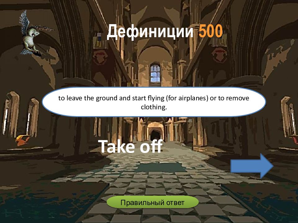 Take off to leave the ground and start flying (for airplanes) or to remove clothing. Дефиниции 500 Правильный ответ